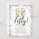 This is an elegant and chic 50th Birthday Party invitation featuring a silvery glitter border, a pair of watercolor champagne glasses and a modern script font. This would be perfect for anyone looking to celebrate their special milestone birthday in style.