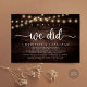 Marque o começo de sua eternidade com elegância rústica usando nossa casa e cordas da vila luzes escuras e castanhas sobre o fundo tematizadas, carta de convite para celebração de elopementos de casamento, "ah sim nós fizemos". Perfeito para os casais estendendo sua alegre ocasião, este convite exude sofisticação com uma sugestão de brincadeira, definindo o palco para um evento memorável. Adorado com um tema design de roteiro moderno de eterno, ele adiciona um toque de encanto refinado às suas festividades. Feito por TeeshaDerrick, este convite promete capturar maravilhosamente sua história de amor.