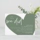 Anuncie e partilhe a sua alegria para sempre em estilo com o nosso moderno verde sábio, com a bonitinha forma de coração tema design (Oh Sim nós fizemos) convite para celebração de elopementos de casamento. É ideal para casais que decidiram celebrar o seu melhor dia. Com seu design sofisticado, mas lúdico, este convite certamente define o tom de um evento inesquecível. O convite apresenta um tema de design de roteiro moderno e minimalista, acrescentando um toque de elegância do eterno à sua celebração. Projetado por TeeshaDerrick