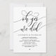 Elegantemente anuncie sua alegria para sempre com nosso moderno tema preto e branco convite para celebração de casamento, "Ah sim nós fizemos". Personalizado para casais continuando sua história de amor, este convite atinge um equilíbrio perfeito de sofisticação e charme, estabelecendo a cena de um evento inesquecível. Com um moderno design de roteiro contemporâneo, ele adiciona um toque de graça eterno ao seu dia especial. Projetado pelo talentoso TeeshaDerrick, este convite é uma expressão na moda do seu amor duradouro.