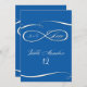 Números de mesa correspondentes para recepções de casamento, chás de noiva, eventos corporativos formais ou outras ocasiões especiais com lugares marcados. PALETA DE CORES: azul real safira cobalto horizonte e branco suave. COLEÇÃO DE DESENHOS: linhas modernas gráficas simples, limpas e ousadas com uma tipografia vintage de caligrafia elegante para um casal de estilo informal. Este conjunto foi desenhado à mão e projetado graficamente pela designer de casamentos personalizados Audrey Jeanne Roberts. As iniciais monogramadas do noivo e da noiva estão no símbolo do infinito. A moda trendy dos Tatuagens de Infinito para o seu anel de casamento combina perfeitamente com este convite elegante. O verso tem outro design de Amor infinito com floreios de caligrafia entretida. Este conjunto de convites de casamento está disponível em qualquer combinação de cores se você entrar em