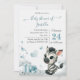 Cute boy baby shower invitation featuring adorable little male zebra with some blue love hearts sitting on clouds