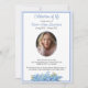 The invite features an oval shaped portrait photo with elegant simple border of a sage green line. Blue small pretty flowers symbolizes everlasting love and remembrance.