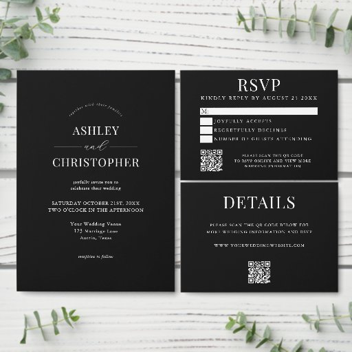 Create your own custom wedding invitations featuring all the details of your special day in simple elegant typography in black and white color.