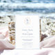 Perfect for an understated and elegant bride wanting to add a nautical twist to her wedding, this smart blue and white wedding invitation design features a simple coastal-inspired monogram with a ship's rope border. On the reverse is a simple pale blue and white wide stripe.