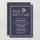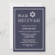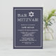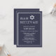 Este convite clássico e simples do Bar Mitzvah apresenta um fundo azul escuro e uma tipografia moderna, com a estrela de David.