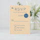 Cartão de resposta ao casamento moderno e elegante com dois corações azuis pequenos, formas retangulares geométricas e um círculo com a data de resposta solicitada dentro num fundo de pêssego claro. +++++++++++++++++ A placa é adequada para a moderna tendência em ambientes interiores em todas as estações clássicas. Recomendado principalmente para recepções cônicas formais.
