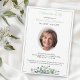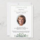 Um belo e elegante convite funerário adorava com simples folhas verdes de eucalipto elegantes. O convite apresenta uma foto de retrato em forma oval com uma elegante borda simples de uma faixa verde. O eucalipto verde simboliza a memória, a paz e a força. Perfeito para um funeral, memorial ou celebração da vida, esta design oferece uma maneira sincera de honrar o seu amado.