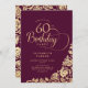 Simples e elegante 60º convite de aniversário em burgundy e ouro. Design clássico com rosas, folha de ouro falsa e letra de script de tipografia. A Trendy convida o cartão perfeito para uma festa de na moda. Personalize com seus próprios detalhes. Pode ser personalizado para qualquer idade. Impressos convites Zazzle ou modelo de impressão digital instantânea para download.