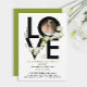 Este convite moderno para festa de Dia dos Namorados apresenta uma letra negra e ousada que escreve "Amor", lindamente decorada com uma delicada grinalda de flores brancas e folhas verdes. Dentro de uma das letras, há uma foto do casal, adicionando um toque pessoal ao design. A parte de trás do convite é um verde vibrante e brilhante, aumentando seu apelo festivo. Este convite elegante também pode ser personalizado para outras ocasiões, como aniversário de casamento, aniversário, Páscoa ou qualquer celebração especial. Com seus acentos florais românticos e recursos personalizáveis, é a maneira perfeita de convidar os convidados para um evento memorável cheio de amor e alegria!