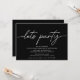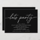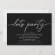 Convites simples e modernos de aniversário com texto de título lendo "vamos party" em script. Adicione os detalhes do evento abaixo. Texto branco sobre um fundo negro.