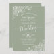 Este belo convite para o casamento apresenta um design simples, mas elegante, com uma caligrafia de escrita falada sobre um fundo verde sábio e um filigre floral friamente branco nos cantos. As cores são perfeitas para uma cerimônia de inverno.