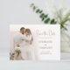 Anuncie seu grande dia com este convite de casamento moderno e na moda Salve a data. Ele apresenta uma foto cativante do casal do casamento, acrescentando um toque pessoal ao design. Os detalhes do convite podem ser facilmente personalizados para se adequarem às suas preferências e fornecerem todas as informações necessárias. Compartilhe o entusiasmo e antecipação do seu casamento futuro com este convite personalizável, definindo o tom para uma celebração memorável com os seus entes queridos.