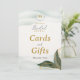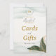 Sinal de Chá de panela de Cores e Presentes de 5 x 7" verde Dourado Elegante. Este espantoso sinal de 5 x 7" é a forma perfeita de direcionar os seus convidados para as cartas e mesa de presentes, ao mesmo tempo que adiciona um toque pessoal e bonito à sua decoração. Projetado para ajustado perfeito em suportes de placa ou clipe (não incluído), seu design de lado duplo apresenta uma imagem espelhada na parte traseira. Isso garante uma exibição sem falhas de qualquer ângulo, fazer-a de uma peça verdadeiramente completa e elegante. A placa é lindamente personalizada com uma contagem final até o grande dia em um estilo único. Abaixo, aparece o nome da futura noiva, seguido de "Chá de panela" em tipografia elegante. As palavras "Cartões e presentes" são colocadas em um roteiro ousado para um toque de talento, e um sincero "OBRIGADO" é adicionado para mostrar gratidão aos seus entes queridos. Tudo isso é colocado contra o impressionante design de água e verde-coloração e ouro da coleção. Este símbolo chic serve tanto como uma bela peça de decoração como um guia claro e funcional, assegurando que cada detalhe de sua celebração seja sofisticado e sem esforço.
