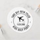 Sinal personalizado de festa do tema viagem com um monograma de avião preto e branco, data e texto de localização personalizado.