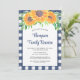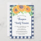 Convide sua família para a reunião deles com este convite floral rústico. É decorada com girassóis de cor aquosa e folhagem em tons de amarelo e verde sobre fundo de gingham azul. Facilmente personalizável com seus detalhes de reunião. Original Watercolor © Michele Davies.