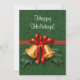 Sinos de Natal, fita vermelha e verde, e folhas holly em um fundo verde de férias festivo. Personalize com seu próprio texto.