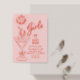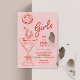 Reúna suas garotas para uma festa de cerveja e tinta! Este design é moderno, moderno, ousado e apresenta cor-de-rosa e vermelho vibrantes. Apresentando um tema de vaquinha com um vidro martini e bola de disco.