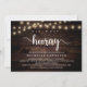 Placa de Chá de panela para caligrafia moderna (Sip, Sip hooray), em luzes de cordas de madeira escura rusticadas, design temática. Convide os convidados com este Cartão de Convite perfeito. Adicione os detalhes do seu chá de panela em texto correspondente.