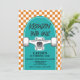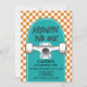 Convite de Aniversário do skate com cheque de laranja e skate azul.