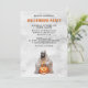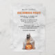 Convite para festas de Halloween com ilustrações de aquarela de um fantasma esqueleto e jack o’lanterns.