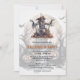 O convite da festa de Dia das Bruxas, com um esqueleto vestido, mansão assombrada, jack-o-lanternas, morcegos e o Lua do cheio.