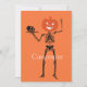 Esqueleto de Halloween com jack o'lantern head segurando seu crânio em um platter para personalizar com sua própria saudação, nome, mensagem, etc