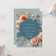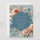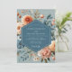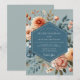 This design features a romantic and elegant floral arrangement. Painterly dahlias and roses in shades of soft peach and dusty coral bloom against a sophisticated slate blue backdrop. Muted green foliage and delicate white accent blossoms complete this artful composition for a timeless event.