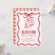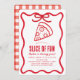 This cute "a slice of fun" kid's birthday invitation features hand-drawn illustrations of a bow and slice of pizza surrounded by a red wavy frame. The reverse side features a white background with a red gingham plaid. Personalize it for your needs. You can find matching products at my store.