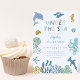 Cartão de convite de aniversário de menino bonito com ilustração de criaturas marinhas e recifes de corais. O texto diz "debaixo do mar".