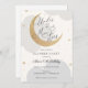 Convite de aniversário com nuvens de aquarelas e estrelas de ouro com lua reluzente e roteiro divertido "Sob a Lua e Estrelas!" Personalize com suas informações ou clique em "clique para personalizar mais" para ajustar o tipo de fonte, o tamanho e a cor.