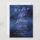 Este convite de casamento mostra um fundo azul escuro do céu noturno cheio de estrelas. A frente do cartão tem também uma bela escrita caligráfica que diz "Sob as Estrelas". Esse convite seria perfeito para quem tivesse um casamento noturno, ou para quem se interessasse por astronomia e espaço.