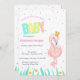 Um belo chá de bebê com um bebê flamingo. Esses convites para chuveiros de bebês são facilmente personalizados para seu evento simplesmente adicionando seus detalhes de evento.
