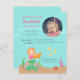 Convite de aniversário bonito e colorido da sereia que tem uma menina pequena dos desenhos animados da sereia com o cabelo alaranjado que se senta em uma rocha. Está fazendo uma onda amigável aos peixes e ao caranguejo que são próximos e aos convidados do partido que são convidados ao partido. Um feminino convida para miúdos e excelente para a sereia ou sob o mar, underwater, oceano e associa festas de aniversário temáticos. Personalize facilmente com suas informação e foto da menina do aniversário.
