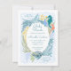 Este convite para o chá de fraldas moderno apresenta ondas giratórias que abraçam uma mãe, cavalo marinho e bebê. Manuscrito pintado de original