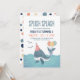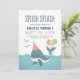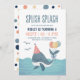O convite "Splish Splash Birthday Bash" apresenta uma baleia fofa num chapéu de festa de aniversário com balões no seu conto, nadando no oceano. Perfeito para náutica, costeira, "Sob o Mar" e praias celebrações temáticas e as cores de verão do azul de praia, do coral, do marinho e do amarelo ensolarado são excelentes para uma menina ou um menino. Arte por KL Stock