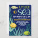 Sob o mar é onde estaremos. Um convite de aniversário divertido com o tema do oceano. Apresenta algas marinhas brancas com peixes submarinos coloridos. Personalize com os detalhes do evento. A cor de fundo pode ser alterada para atender à sua preferência.