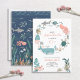 Seu bebê está virando um! Convide seus convidados especiais com este adorável moderno sob o tema do mar convite com uma 'coroa' de animais oceânicos pintados à mão incluindo uma baleia, coral, polvo e muito mais, com tipografia escrita escrita à mão. A parte de trás da carta apresenta uma ilustração do tema do oceano submarino. Copyright Elegant Invites, todos os direitos reservados.