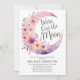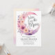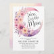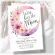 Convites personalizáveis para vitrines de lua floral, que incluem uma lua crescente pastel a água e decoração floral sobre fundo branco.