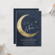 Um doce convite para o chá do bebê do Céu da Lua, que apresenta uma ilustração aquática de uma lua crescente móvel sobre um fundo marinho azul-aquarela profundo, com efeitos dourados sobre a lua e as estrelas ( note que estes são efeitos digitais, não uma folha real!). Perfeito para futuros pais que amam o tema da lua, a lua, as estrelas e os temas celestes.