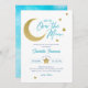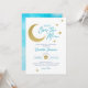 Celebrar um bebê a caminho com este sonhador convite para o chá de fraldas "Sobre a Lua", com uma lua crescente reluzente de ouro, estrelas dispersas e um fundo azul de cor aquática macia. Um charmoso design celeste perfeito para chás de fraldas cósmicos, cintilação, ou com tema estelar.