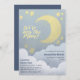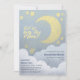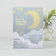 Jogue uma lua neutra de gênero e as estrelas chás de fraldas com este belo convite de chá de fraldas azul e amarelo. Este convite para chás de fraldas é personalizável. Você pode editar o texto clicando em "personalizar este modelo". Este cartão apresenta nuvens texturizadas azuis e um fundo noturno estrelado com uma lua amarela brilhante. O texto diz "Estamos sobre a lua".