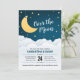 Uma lua crescente está amarrada com cordas contra um céu noturno acima de nuvens brancas lisas. As estrelas ouros salpicam o fundo do céu noturno do cobalto para anunciar que os novos pais estão "Sobre a Lua" com felicidade. Unisex e versátil para qualquer celebração de bebês seja um chá de fraldas, um bebê aspersor, ou um gole e veja. Disponível com produtos correspondentes.