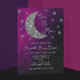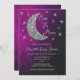 Sobre o chá de fraldas da lua com lua de prata e estrelas contra um fundo negro e rosa do céu noturno roxo