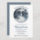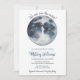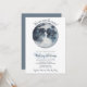 Sobre o convite ao chá de fraldas da lua há uma lua de aquarela na frente e na lua, de volta, com pedido de livro.