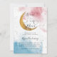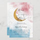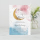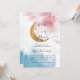 Cartão de convite para chá de fraldas de garotinho e garotinha sonhador com arte aquosa de céu azul e rosa com lua de ouro e estrelas. O texto diz "estamos sobre a lua."
