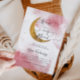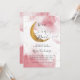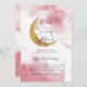 Cartão de convite para chá de fraldas da menina Dreamy com arte aquosa de céu cor rosa com lua de ouro falsa e estrelas. O texto diz "estamos sobre a lua."