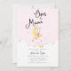 Um doce convite de chá de fraldas de menina com um tema sobre a lua, lua e estrelas, apresentando uma menina de coelho bonita segurando um coração cor-de-rosa, sentada em um celular da lua. O título "Sobre a Lua" está na caligrafia moderna da escrita.