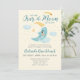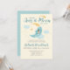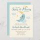 Um adorável convite para chás de fraldas da lua, com meia lua bonitinha com nuvens, estrelas e o ditado "Estamos sobre a lua com alegria. Sacudir nosso convite para ver um padrão de estrelas azul e branca para um toque especial extra. Projetado para você pelo Blackberry Boulevard.