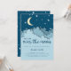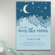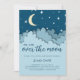 Adorável sobre o convite do chá de fraldas azul da lua com uma ilustração fofa de algumas estrelas azuis, uma lua amarela e nuvens azuis. A ilustração é feita de forma que ela olha em três dimensões mas note que é apenas um efeito e que é na verdade um impressão. Todo o texto está em azul escuro e pode ser personalizado. Ilustrada e projetada por Patricia Alvarez.
